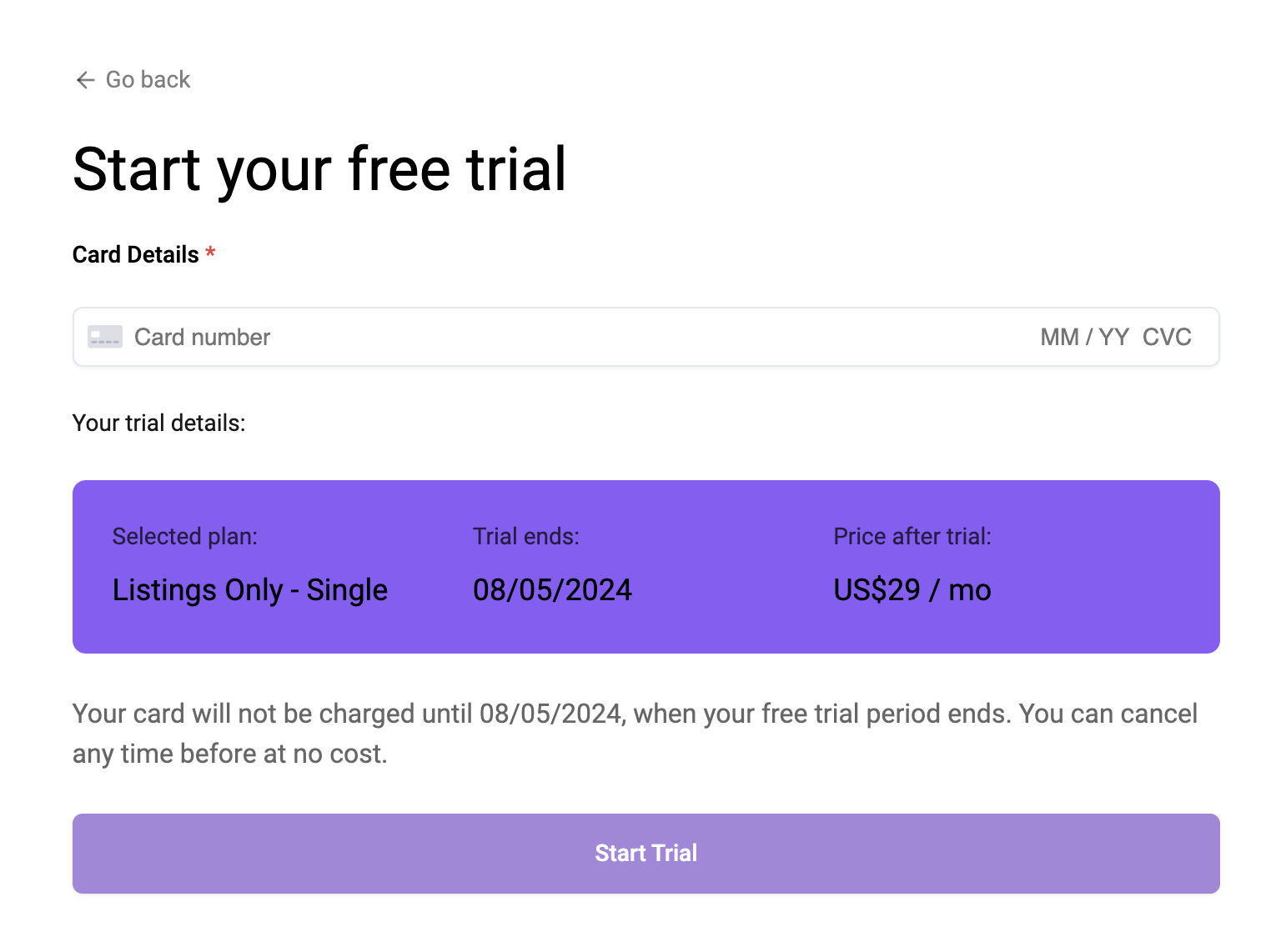 You will need to choose a plan to and enter details. You will not be charged until after your free trial expires and can cancel at any time by contacting [email protected]
